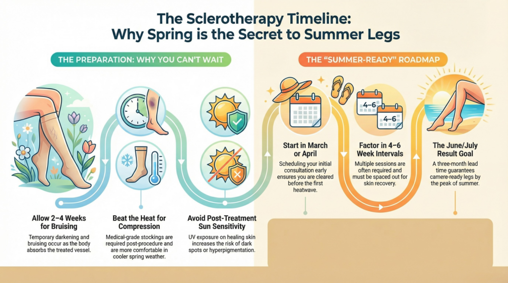 One of the biggest mistakes patients make is waiting until the week before a beach vacation to book their sclerotherapy session. If you want to show off clear, smooth legs, you must plan ahead. Sclerotherapy is not an overnight fix; it is a process that requires a specific healing timeline.