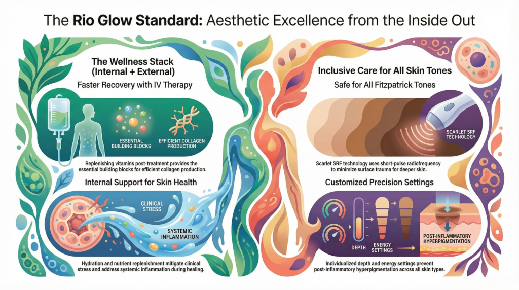 However, because Scarlet SRF uses short-pulse radiofrequency, the energy is delivered in a way that minimizes surface trauma, making it significantly safer for all skin types. We take the time to customize our depth and energy settings to ensure that everyone, regardless of skin tone, can enjoy the benefits of the “Rio Glow Stack” without the fear of adverse reactions.