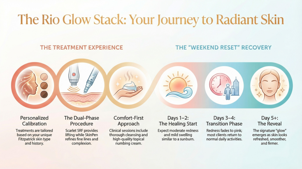 The “Rio Glow Stack” is performed in a clinical, comfortable environment. Here is how the process generally unfolds: